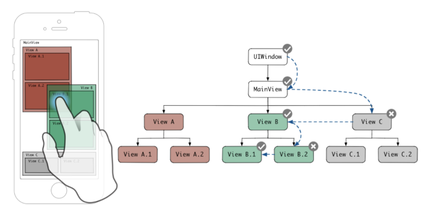 point가 true를 반환하면, 하위 View 계층구조는 지정된 point를 포함하는 가장 앞에 있는 View를 찾을 때까지 재귀적으로 찾는다.