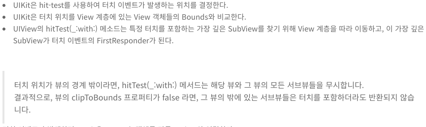 - hitTest = 해당 point를 통해 리시버로부터 가장 먼 SubView를 반환